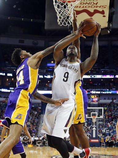 New Orleans Pelicans forward Terrence Jones (9) goes to the basket between Los Angeles Lakers forward Brandon Ingram (14) and center Tarik Black in the first half of an NBA basketball game in New Orleans, Tuesday, Nov. 29, 2016. (AP Photo/Gerald Herbert) The Associated Press