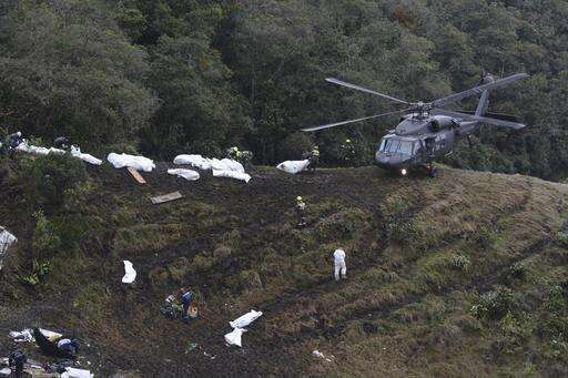 Rescue workers place the bodies of victims of an airplane crash into a waiting helicopter, in La Union, near Medellin, Colombia, Tuesday, Nov. 29, 2016. The chartered plane was carrying a Brazilian soccer team to the biggest match of its history when it crashed into a Colombian hillside and broke into pieces, Colombian officials said Tuesday. (AP Photo/Luis Benavides) The Associated Press