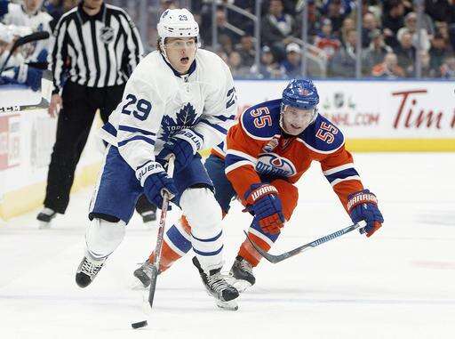 Toronto Maple Leafs' Auston Matthews (34) is chased by Edmonton Oilers' Darnell Nurse (25) during first period NHL hockey action in Edmonton, Alberta, Tuesday Nov. 29, 2016. (Jason Franson/The Canadian Press via AP) The Associated Press