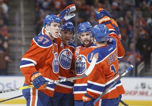 Edmonton Oilers' Connor McDavid (97), Andrej Sekera (2), Kris Russell (4) and Jordan Eberle (14) celebrate a goal against the Toronto Maple Leafs during second period NHL hockey action in Edmonton, Alberta, Tuesday Nov. 29, 2016. (Jason Franson/The Canadian Press via AP) The Associated Press