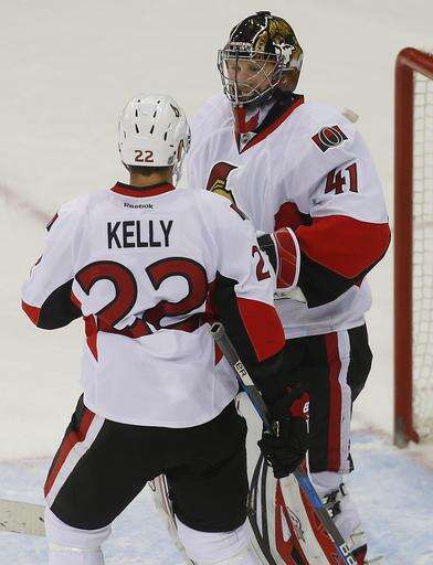 Ottawa Senators' goaltender Craig Anderson (41) is congratulated by teammate Chris Kelly (22) after recording a shutout against the New York Rangers at an NHL hockey game in New York, Sunday, Nov. 27, 2016. (AP Photo/Rich Schultz)