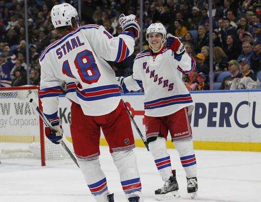 New York Rangers forward Jesper Fast (19) and defenseman Marc Staal (18) celebrate a goal during the second period of an NHL hockey game against the Buffalo Sabres, Thursday, Dec. 1, 2016, in Buffalo, N.Y. (AP Photo/Jeffrey T. Barnes) The Associated Press