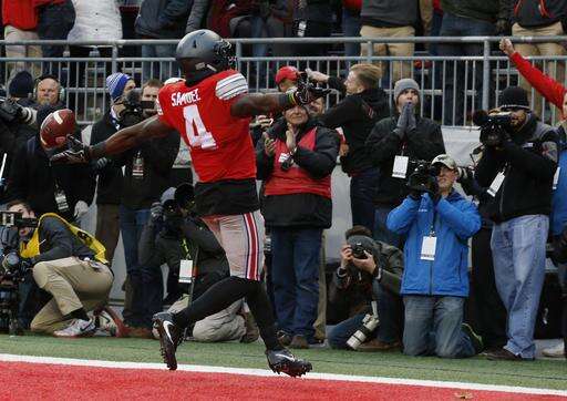 FILE - In this Saturday, Nov. 26, 2016, file photo, Ohio State running back Curtis Samuel celebrates his touchdown against Michigan during the second overtime of an NCAA college football game in Columbus, Ohio. Ohio State beat Michigan 30-27 in double overtime. Geologists measuring vibrations caused by boisterous Ohio State football fans say the Buckeyes' game-winning touchdown in double overtime against rival Michigan had Ohio Stadium rocking more than any other time this season. (AP Photo/Jay LaPrete, File)