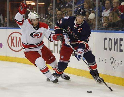NOTES: The Rangers' 13-game home winning streak against Carolina is the longest home winning streak the Rangers have posted against one opponent in franchise history. . D Adam Clendening and F Oscar Lindberg were healthy scratches for New York. . F Mika Zibanejad missed his seventh consecutive game with a broken left fibula. F Elias Lindholm did not suit up after leaving the Hurricanes last game against Boston with a lower-body injury. . F Bryan Bickell missed his 16th straight game with multiple sclerosis. . Carolina scratched D Klas Dahlbeck and D Ryan Murray.