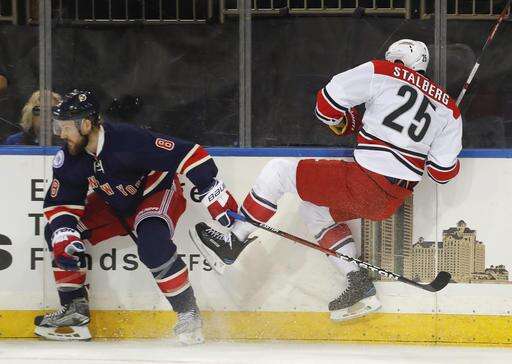 Stalberg, who scored twice in the Hurricanes' loss here Tuesday night, tied it as he beat Lundqvist with a wrist shot on the glove side. Rangers captain Ryan McDonagh tried to skate the puck out of trouble but turned it over in the neutral zone leading to Carolina's odd man rush.