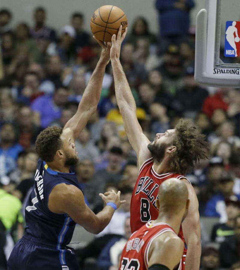 Chicago Bulls center Robin Lopez (8) blocks a shot by Dallas Mavericks forward Dwight Powell (7) during the first half of an NBA basketball game in Dallas, Saturday, Dec. 3, 2016. (AP Photo/LM Otero)