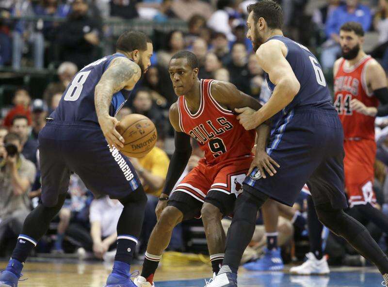 Chicago Bulls guard Rajon Rondo (9) tries to defend against Dallas Mavericks guard Deron Williams (8) as Mavericks center Andrew Bogut (6) grabs him during the first half of an NBA basketball game in Dallas, Saturday, Dec. 3, 2016. (AP Photo/LM Otero)