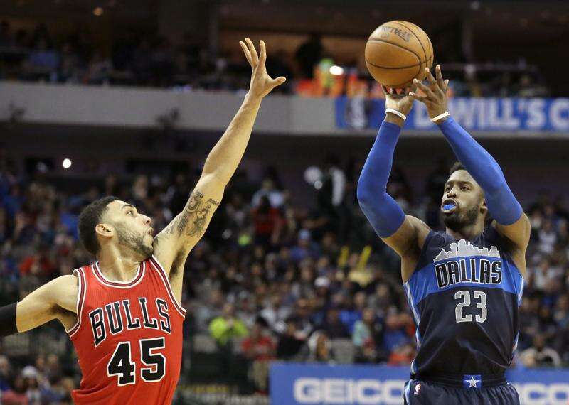 Dallas Mavericks guard Wesley Matthews (23) shoots against Chicago Bulls guard Denzel Valentine (45) during the second half of an NBA basketball game in Dallas, Saturday, Dec. 3, 2016. (AP Photo/LM Otero)