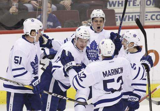 Toronto Maple Leafs' Austin Matthews (34) celebrates his goal with teammates Jake Gardiner (51), left, Zach Hyman (11), Martin Marincin (52) and Connor Brown (12) during the third period of an NHL hockey game in Vancouver, British Columbia, Saturday, Dec. 3, 2016. (Ben Nelms/The Canadian Press via AP) The Associated Press
