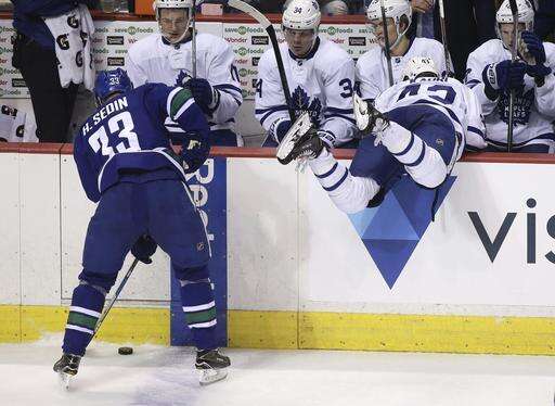 Vancouver Canucks' Henrik Sedin (33) plays the puck near the Toronto Maple Leafs bench as the Leafs' Nazem Kadri (43) goes up the boards during the second period of an NHL hockey game in Vancouver, British Columbia, Saturday, Dec. 3, 2016. (Ben Nelms/The Canadian Press via AP) The Associated Press