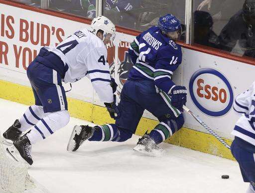 Vancouver Canucks' Alexandre Burrows (14) is sent into the boards by Toronto Maple Leafs' Morgan Rielly (44) during the second period of an NHL hockey game in Vancouver, British Columbia, Saturday, Dec. 3, 2016. (Ben Nelms/The Canadian Press via AP) The Associated Press