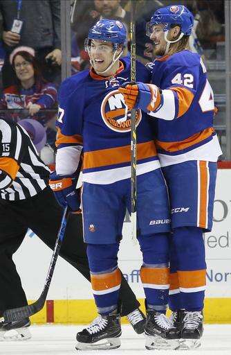 New York Islanders' left wing Anders Lee (27), left, and New York Islanders' defenseman Scott Mayfield (42) celebrate Mayfield's goal during the first period of an NHL hockey game against the New York Rangers, Tuesday, Dec. 6, 2016, in New York. (AP Photo/Kathy Willens) The Associated Press