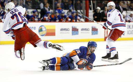 New York Islanders' right wing Cal Clutterbuck (15) lands on the ice as New York Rangers' defenseman Brady Skjei (76) goes flying past him after a collision during the second period of an NHL hockey game, Tuesday, Dec. 6, 2016, in New York. (AP Photo/Kathy Willens) The Associated Press