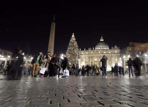 People pose for a photograph in front a the lit Christmas Tree and nativity scene in St. Peter's Square, at the Vatican, Friday, Dec. 9, 2016. (AP Photo/Andrew Medichini)