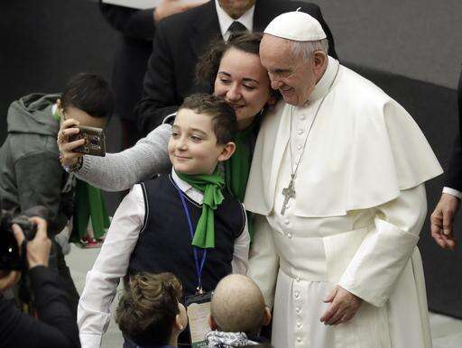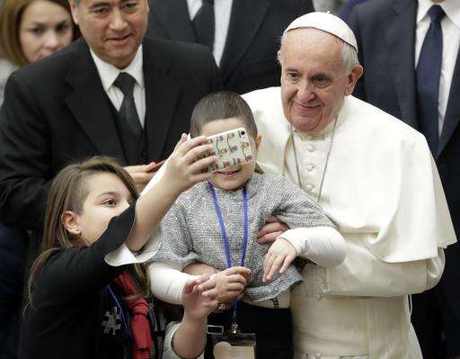 Pope Francis pauses for a selfie with children during an audience with the donors of the Christmas tree and Nativity scene set up in St. Peter's Square, in Paul VI Hall, at the Vatican, Friday, Dec. 9, 2016. The Christmas tree was donated from the Trentino region, and the Nativity scene comes from Malta. (AP Photo/Andrew Medichini)