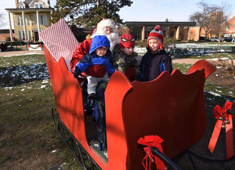 Declan Okerberg, 7 months, of Libertyville, left, and his brothers Reed, 2, center, and Cole, 4, visit with Santa Claus in his sleigh during the Dickens of a Holiday event in Libertyville Saturday.