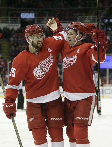 Detroit Red Wings center Dylan Larkin, right, celebrates his goal with defenseman Mike Green (25) during the second period of an NHL hockey game against the Columbus Blue Jackets, Friday, Dec. 9, 2016, in Detroit. (AP Photo/Duane Burleson) The Associated Press
