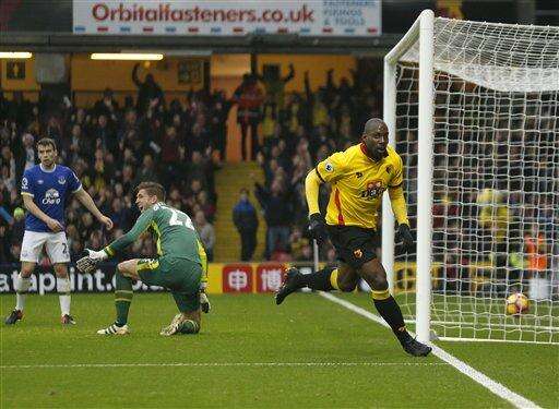 Watford's Stefano Okaka scores his side's first goal of the game during the Premier League soccer match between Watford and Everton at Vicarage Road Stadium, Watford, England. Saturday Dec 10 2016. (Paul Harding/PA via AP) The Associated Press