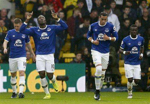 Everton's Romelu Lukaku celebrates scoring his side's second goal of the gameduring the Premier League soccer match between Watford and Everton at Vicarage Road Stadium, Watford, England. Saturday Dec 10 2016. (Paul Harding/PA via AP) The Associated Press