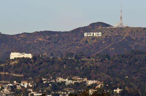 The Hollywood sign is seen vandalized Sunday, Jan. 1, 2017. Los Angeles residents awoke New Year's Day to find a prankster had altered the famed Hollywood sign to read "HOLLYWeeD." Police have notified the city's Department of General Services, whose officers patrol Griffith Park and the area of the rugged Hollywood Hills near the sign. California voters in November approved Proposition 64, which legalized the recreational use of marijuana, beginning in 2018. (AP Photo/Damian Dovarganes)