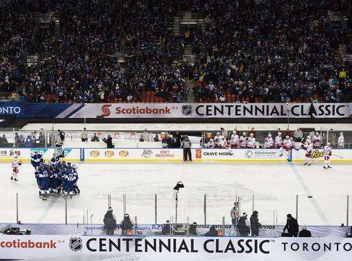 In this Jan. 1, 2017 file photo, Toronto Maple Leafs center Auston Matthews (34) and his teammates celebrate his game winning overtime goal against the Detroit Red Wings in the NHL Centennial Classic hockey game in Toronto. The franchise is celebrating its 100th year while also trying to move past half a century without a championship. And what better way to do so than to bring back the old guard, including members of the 1967 team, the last Maple Leafs squad to win a Stanley Cup. George Armstrong, Dave Keon, Johnny Bower - meet Mitch Marner, Auston Matthews, William Nylander and company. (Nathan Denette/The Canadian Press via AP) The Associated Press