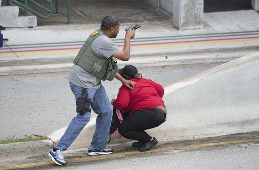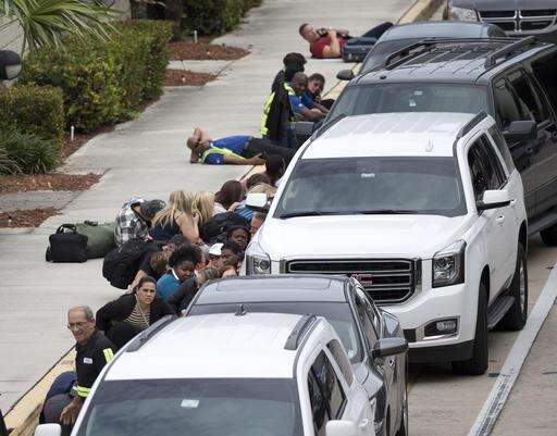 People take cover outside Fort Lauderdale–Hollywood International Airport, Friday, Jan. 6, 2017, in Fort Lauderdale, Fla., after a shooter opened fire inside a terminal of the airport, killing several people and wounding others before being taken into custody. (AP Photo/Wilfredo Lee) The Associated Press