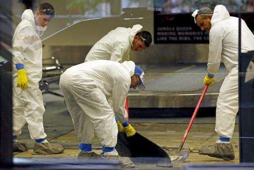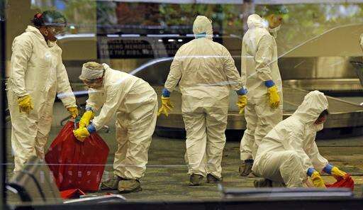 A hazmat crew cleans up baggage claim Terminal Two on Saturday, Jan. 7, 2017 at Fort Lauderdale-Hollywood International Airport Terminal the day after multiple people were shot on Friday.(Al Diaz/Miami Herald via AP) The Associated Press