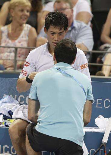 Kei Nishikori of Japan talks to a medical member after an injury in his final match against Grigor Dimitrov of Bulgaria at the Brisbane International tennis tournament in Brisbane, Australia, Sunday, Jan. 8, 2017. (AP Photo/Tertius Pickard) The Associated Press