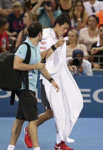 Kei Nishikori of Japan, right, leaves the court with a medical staff member after an injury in his final match against Grigor Dimitrov of Bulgaria at the Brisbane International tennis tournament in Brisbane, Australia, Sunday, Jan. 8, 2017. (AP Photo/Tertius Pickard) The Associated Press