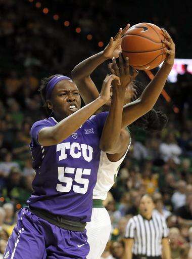 TCU center Carol Willie (55) struggles with Baylor's Khadijiah Cave, right, over control of a rebound in the first half of an NCAA college basketball game, Wednesday, Jan. 11, 2017, in Waco, Texas. (AP Photo/Tony Gutierrez) The Associated Press