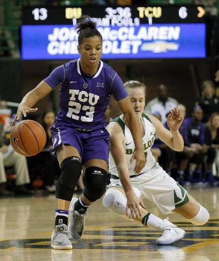 TCU guard AJ Alix (23) maintains control of the ball as Baylor guard Kristy Wallace of Australia attempts a steal in the first half of an NCAA college basketball game, Wednesday, Jan. 11, 2017, in Waco, Texas. (AP Photo/Tony Gutierrez) The Associated Press