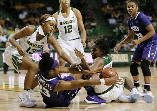 Baylor's Nina Davis (13) and Khadijiah Cave, right, scramble with TCU's Adeola Akomolafe (33) for control of a ball in the second half of an NCAA college basketball game, Wednesday, Jan. 11, 2017, in Waco, Texas. (AP Photo/Tony Gutierrez) The Associated Press