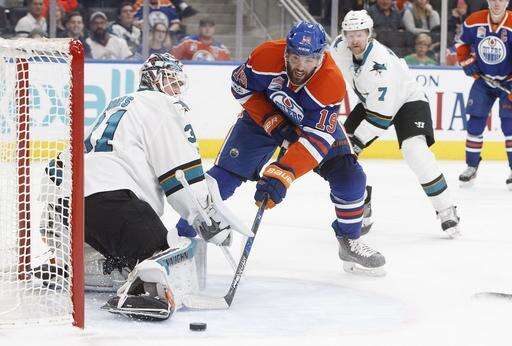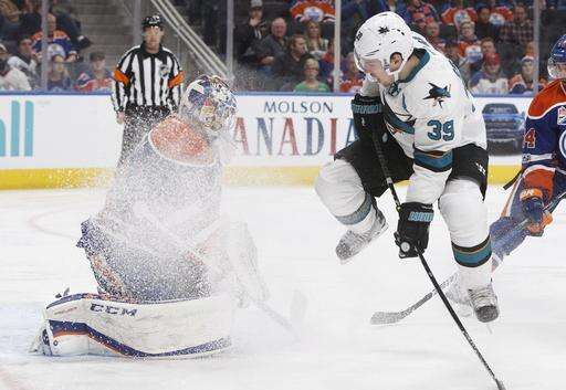 San Jose Sharks' Logan Couture (39) tries to screen Edmonton Oilers' goalie Cam Talbot (33) during the first period of an NHL hockey game, Tuesday, Jan. 10, 2017 in Edmonton, Alberta. (Jason Franson/The Canadian Press via AP)