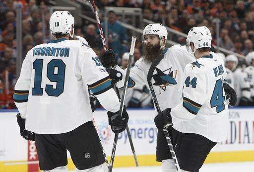 San Jose Sharks' Joe Thornton (19), Brent Burns (88) and Marc-Edouard Vlasic (44) celebrate a goal against the Edmonton Oilers during the first period of an NHL hockey game, Tuesday, Jan. 10, 2017 in Edmonton, Alberta. (Jason Franson/The Canadian Press via AP)
