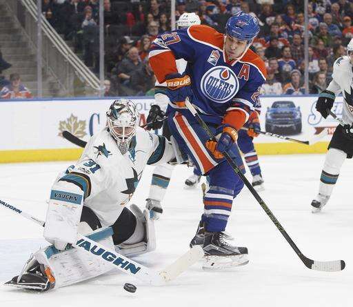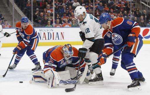 San Jose Sharks' Patrick Marleau (12) is stopped by Edmonton Oilers' goalie Cam Talbot (33) as Kris Russell (4) and Adam Larsson (6) look for the rebound during the first period of an NHL hockey game, Tuesday, Jan. 10, 2017 in Edmonton, Alberta. (Jason Franson/The Canadian Press via AP)
