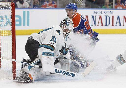 San Jose Sharks' goalie Martin Jones (31) makes the save on Edmonton Oilers' Connor McDavid (97) during the second period of an NHL hockey game, Tuesday, Jan. 10, 2017 in Edmonton, Alberta. (Jason Franson/The Canadian Press via AP)