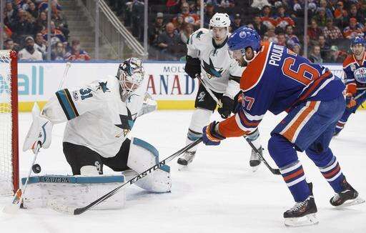 San Jose Sharks' goalie Martin Jones (31) makes a save on Edmonton Oilers' Benoit Pouliot (67) during the second period of an NHL hockey game, Tuesday, Jan. 10, 2017 in Edmonton, Alberta. (Jason Franson/The Canadian Press via AP)