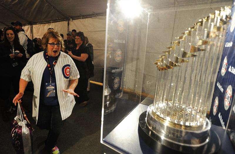 Chicago Cubs fan Jo Finger, of Wapella, Illinois is in shock as she approachs the World Series trophy at the 32nd annual Cubs Convention in Chicago on Friday.