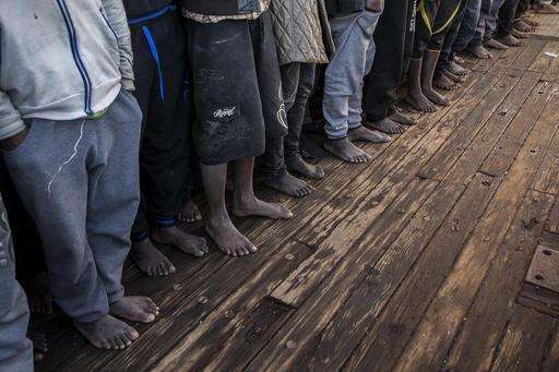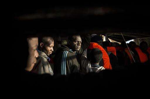 In this Saturday Jan. 14, 2017 photo, migrants from Mali stand at the deck of the Golfo Azzurro vessel after being rescued from the Mediterranean sea, about 20 miles north of Ra's Tajura, Libya. Spain's maritime rescue service says the bodies of seven African migrants have been found dead along the Strait of Gibraltar since Friday. (AP Photo/Olmo Calvo) The Associated Press