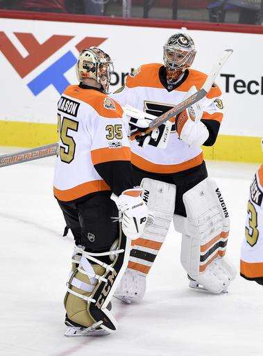 Philadelphia Flyers goalie Steve Mason (35) skates toward the bench as goalie Michal Neuvirth, right, of the Czech Republic, greets him after he was pulled during the third period of an NHL hockey game against the Washington Capitals, Sunday, Jan. 15, 2017, in Washington. (AP Photo/Nick Wass) The Associated Press