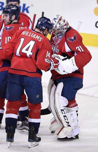 Washington Capitals right wing Justin Williams (14) celebrates a win over the Philadelphia Flyers with goalie Philipp Grubauer (31), of Germany, after an NHL hockey game, Sunday, Jan. 15, 2017, in Washington. (AP Photo/Nick Wass) The Associated Press