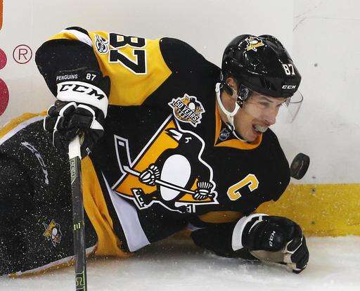 Pittsburgh Penguins' Sidney Crosby falls to the ice as the puck bounces in front of him in the first period of an NHL hockey game against the Washington Capitals in Pittsburgh, Monday, Jan. 16, 2017. (AP Photo/Gene J. Puskar) The Associated Press