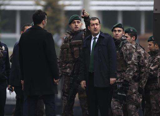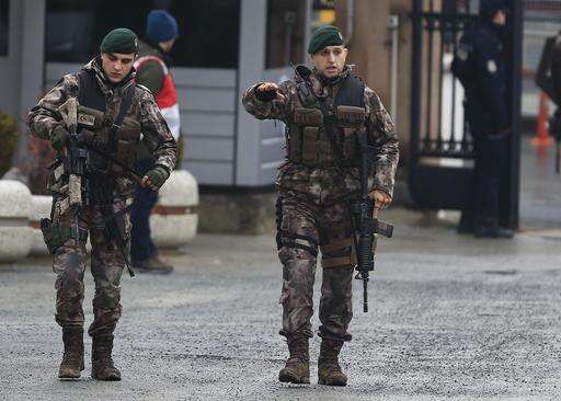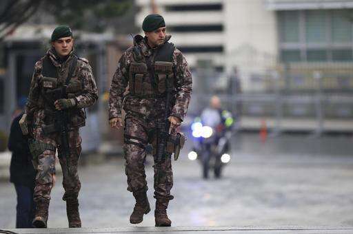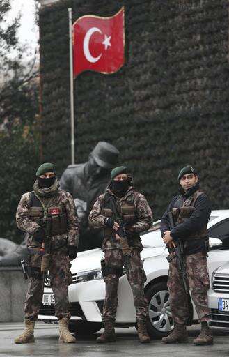 Turkish police officers stand guard at Istanbul's headquarters prior to a news conference regarding the arrest of a suspect of New Year's nightclub attack, in Istanbul, Tuesday, Jan. 17, 2017. Turkish officials on Tuesday confirmed that the gunman who carried out the deadly New Year's attack on an Istanbul nightclub, which was claimed by the Islamic State group, has been detained. (AP Photo/Lefteris Pitarakis)