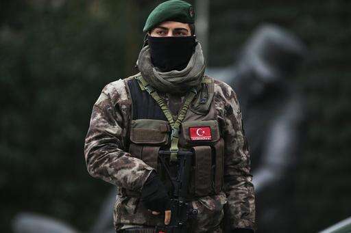 A Turkish police officer stands guard at Istanbul's headquarters prior to a news conference regarding the arrest of a suspect of New Year's nightclub attack, in Istanbul, Tuesday, Jan. 17, 2017. Turkish officials on Tuesday confirmed that the gunman who carried out the deadly New Year's attack on an Istanbul nightclub, which was claimed by the Islamic State group, has been detained. (AP Photo/Lefteris Pitarakis)