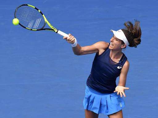 Britain's Johanna Konta makes a forehand return to Belgium's Kirsten Flipkens during their first round match at the Australian Open tennis championships in Melbourne, Australia, Tuesday, Jan. 17, 2017. (AP Photo/Andy Brownbill) The Associated Press