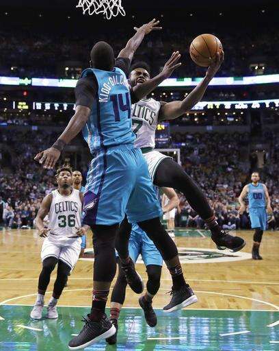 Boston Celtics forward Jaylen Brown, left, drives to the basket against Charlotte Hornets forward Michael Kidd-Gilchrist (14) during the first quarter of an NBA basketball game in Boston, Monday, Jan. 16, 2017. (AP Photo/Charles Krupa) The Associated Press