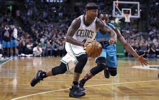 Boston Celtics guard Isaiah Thomas (4) drives to the basket past Charlotte Hornets guard Kemba Walker (15) during the first quarter of an NBA basketball game in Boston, Monday, Jan. 16, 2017. (AP Photo/Charles Krupa) The Associated Press