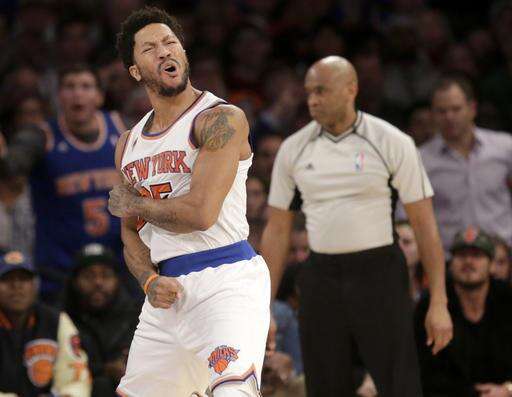 New York Knicks' Derrick Rose reacts to an officials call during the second half of the NBA basketball game against the Atlanta Hawks, Monday, Jan. 16, 2017 in New York. The Hawks defeated the Knicks 108-107. (AP Photo/Seth Wenig) The Associated Press