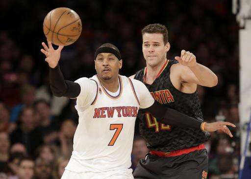 Atlanta Hawks' Kris Humphries, right, defends New York Knicks' Carmelo Anthony during the second half of the NBA basketball game, Monday, Jan. 16, 2017 in New York. The Hawks defeated the Knicks 108-107. (AP Photo/Seth Wenig) The Associated Press