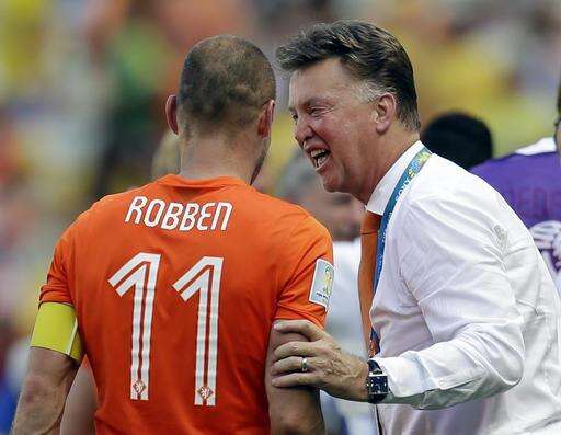 FILE - This is a Sunday, June 29, 2014 file photo of Netherlands' Arjen Robben as he is greeted by head coach Louis van Gaal after the World Cup round of 16 soccer match between the Netherlands and Mexico at the Arena Castelao in Fortaleza, Brazil. Former Manchester United, Barcelona, Bayern and Netherlands coach Louis van Gaal may never return to coaching. The 65-year-old Dutchman has not led a team since being fired by Manchester United in May.(AP Photo/Natacha Pisarenko, File)